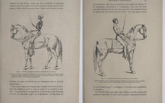 « l'enveloppe et l'étendue sont préférables à l'assiette »: l'avvolgimento (delle gambe) e la ampiezza (della superficie di contatto) sono preferibili all'assetto... è nata la teoria della gamba fasciante che sarà messa in pratica dal D'Auvergne & C.  nell'ambito dell'equitazione militare.